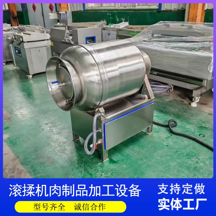 在设备构造方面,级真空滚揉机采用全304不锈钢材质。这种材料不仅符合食品安全标准,还具有优异的强度和耐腐蚀性,能够适应高盐、高湿的加工环境。滚筒内部通常采用镜面抛光处理,表面粗糙度低,既有利于物料流动,也便于清洁。真空系统配备高精度传感器和多重密封装置,确保在长时间运行中维持稳定的真空环境。